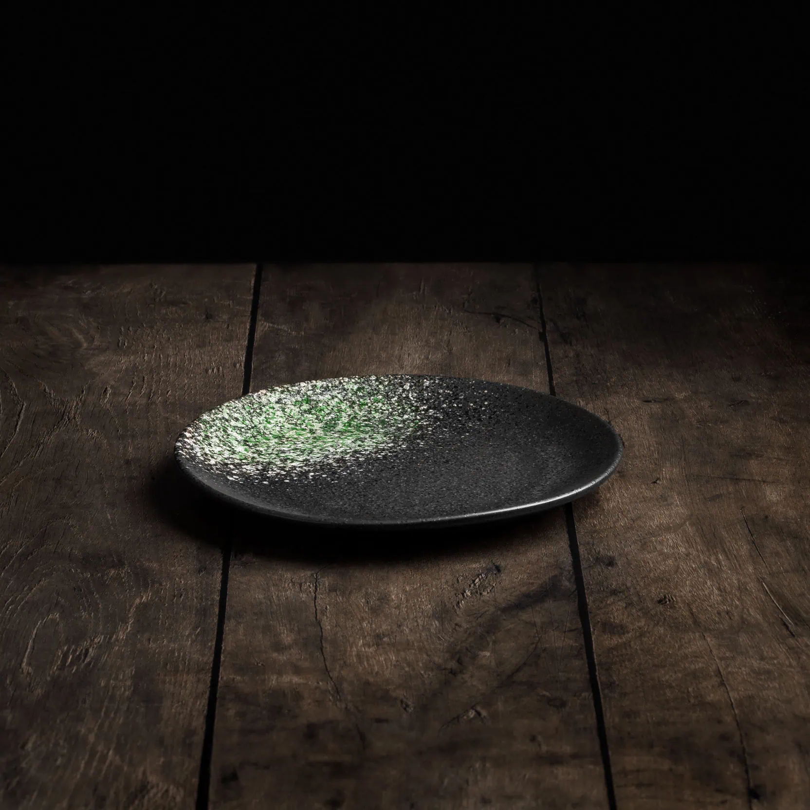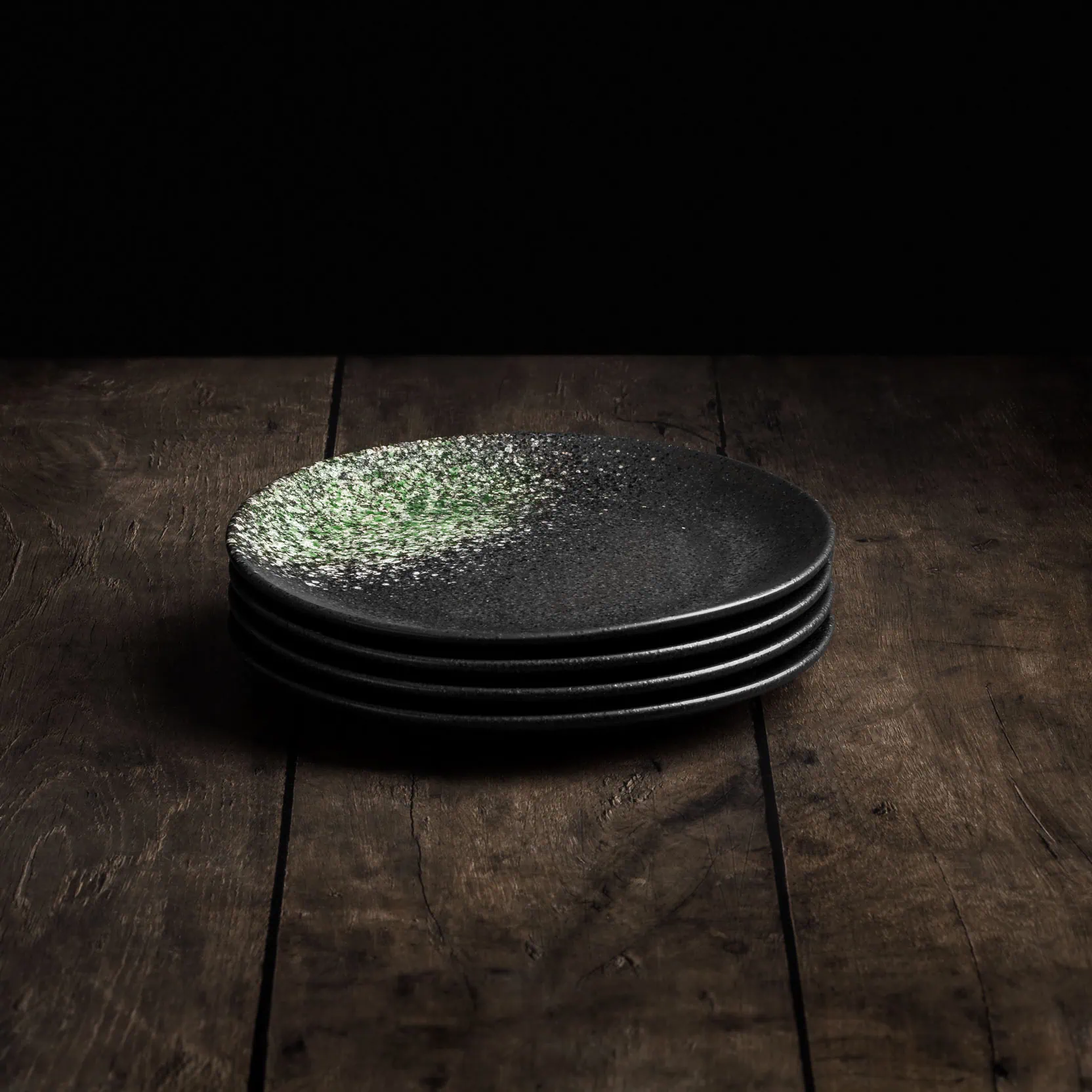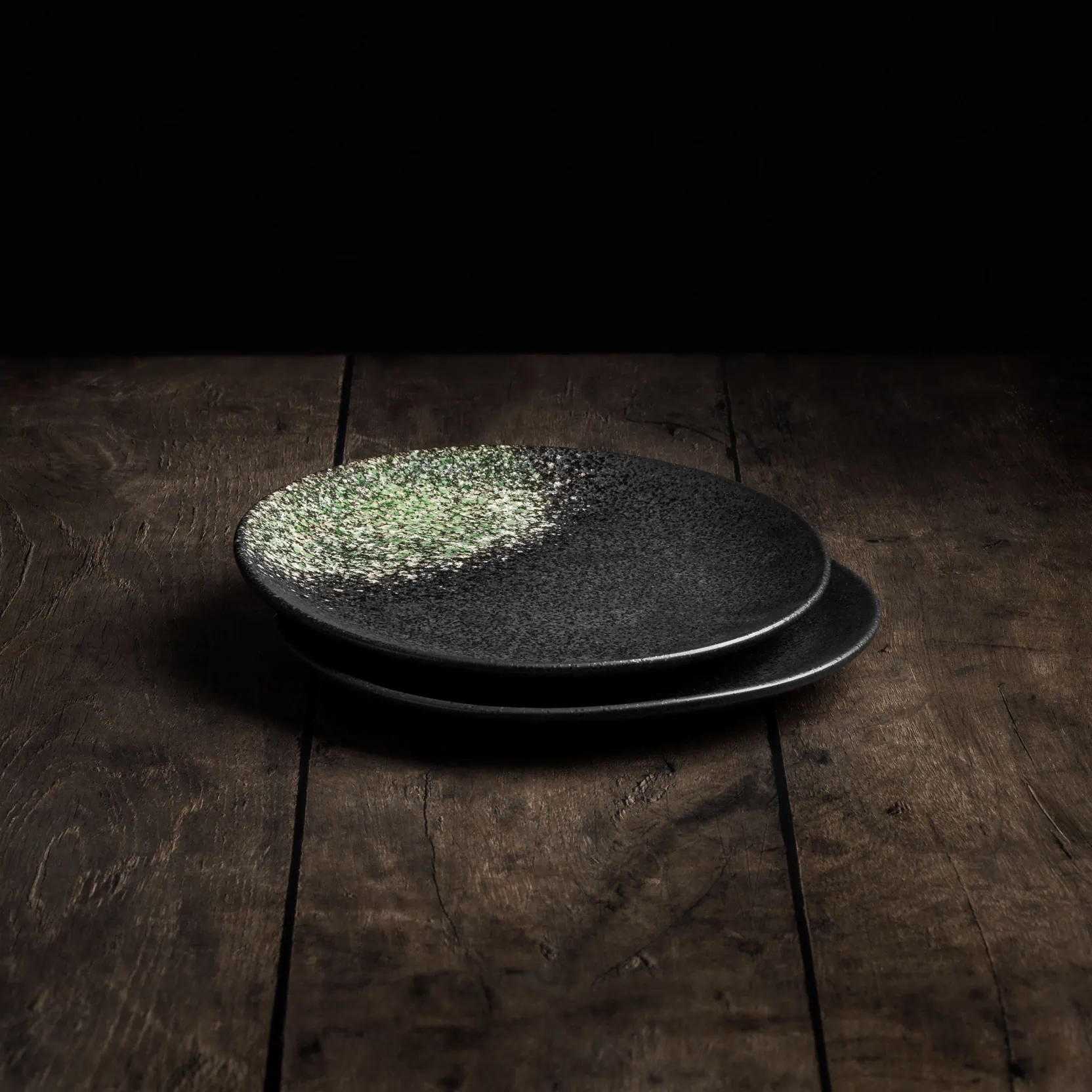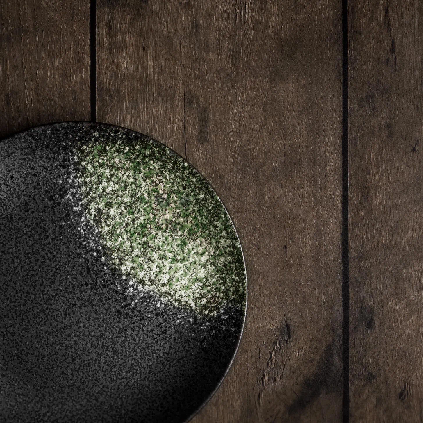 Die kunstvolle Kombination aus der schwarzen Glasur und den grünen Farbsprenkeln verwandelt jeden der handgefertigten Teller mit seidenmattem Finish in ein einzigartiges Unikat. Jedes Stück erzählt seine eigene Geschichte und verkörpert die Tradition der japanischen Keramikkunst.